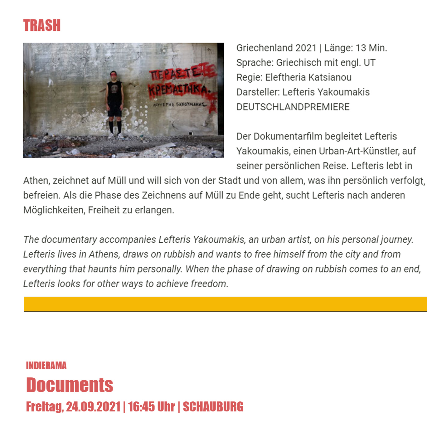 The film had its world premiere at the Independent Days International Film Festival in Karlsruhe and its Greek premiere at the 15th DocFest in Chalkida. It was also screened at the 26th Canberra Short Film Festival in Australia.