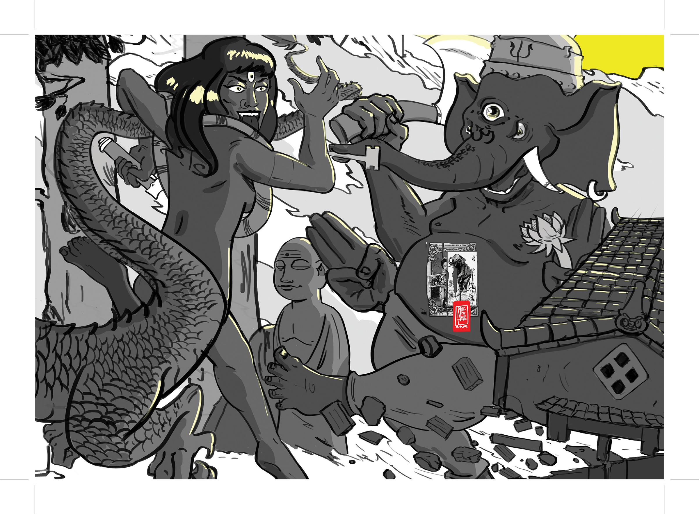 Ganesh, the patron saint of space, is there. In order to create, you have to destroy. So, the goddess Kali will stand in front of him. I will add a dragon to run through the image as the gap runs through the whole, to add rhythm. Also, a small elephant, to remind who commissioned the mural. What do they all do together? They dance, they create chaos, they destroy to create. The de-symbolization of the mural depictions I am attempting here is of minor importance. They are figments of my imagination as I hover on a ladder with brushes in my hand…