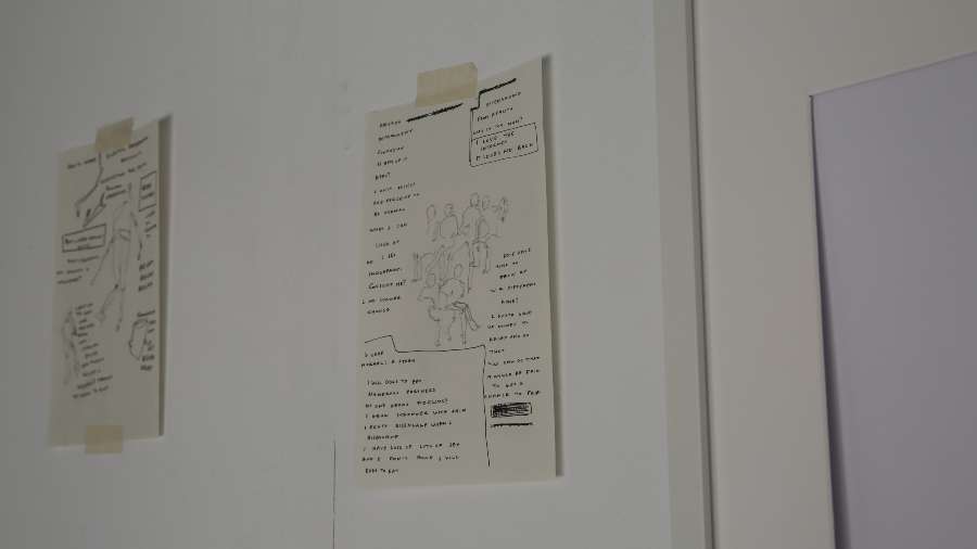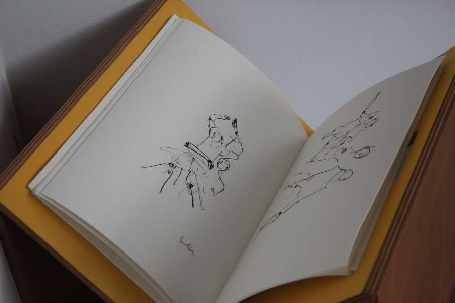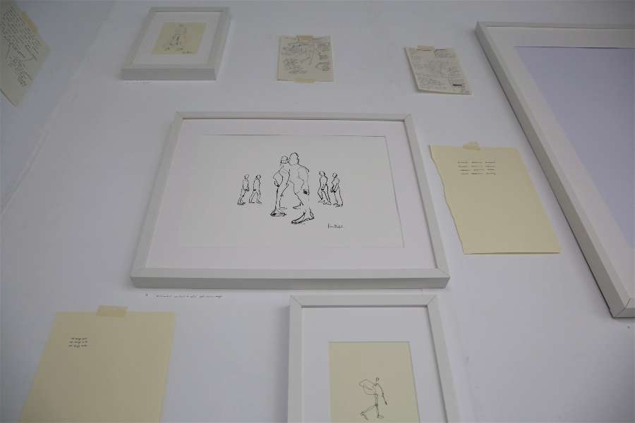 Light pencil strokes , and in other places dark ones. Strokes that reveal human figures. Dancing figures. Or maybe figures that fight. That hug each other. Or push you away. Figures that have faith. That have lost their faith. That love. That cry. That are like children. That are getting old. That are constantly moving. So many figures , just like the lines that live on our skins. They become free, they escape from the paper. They become bodies. They appear in front of our eyes, just like ghosts. You can't be sure that you've actually seen them. They exist between the pencil that touches them and the white surface they are part of.