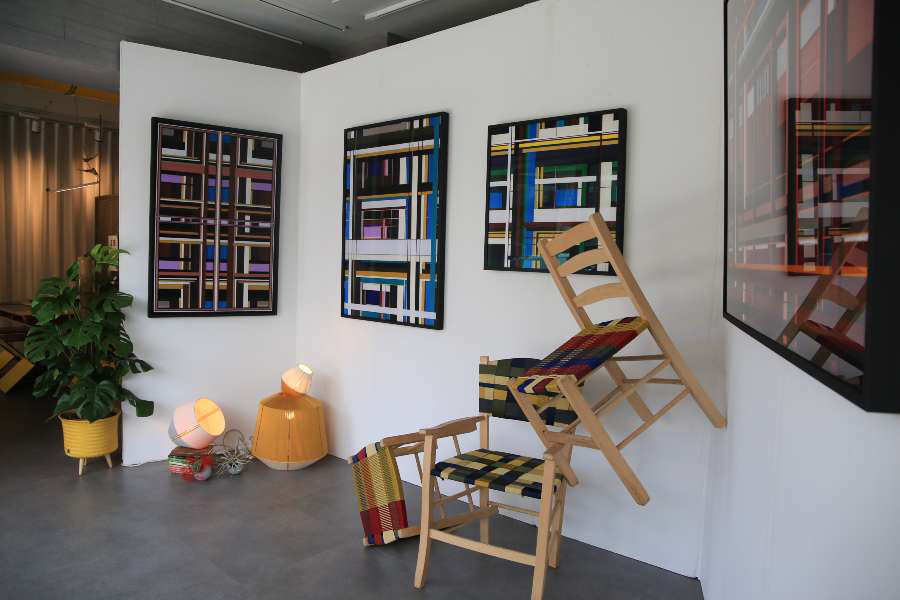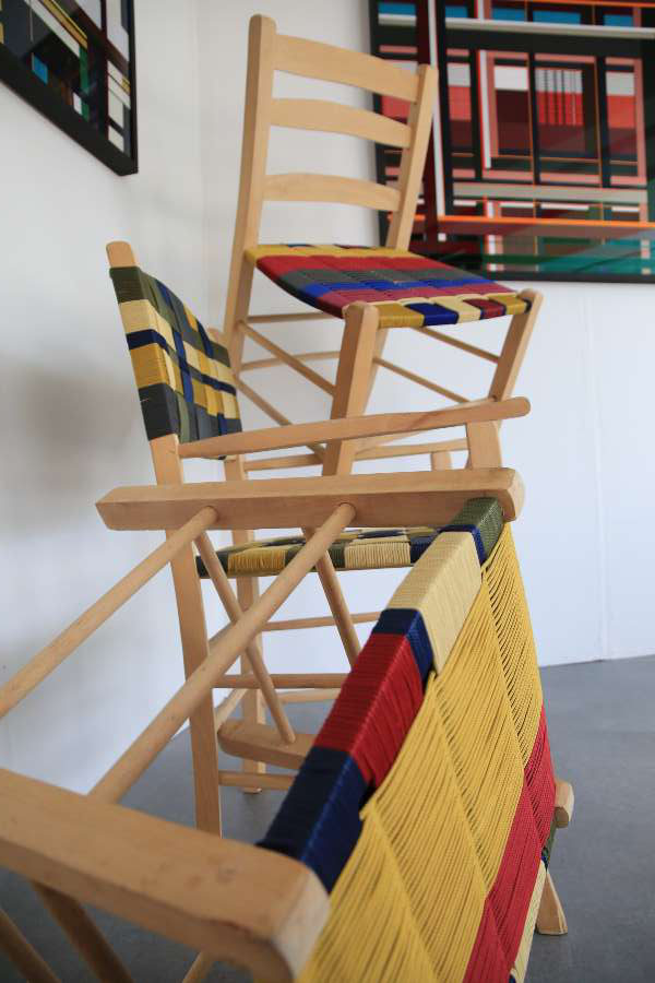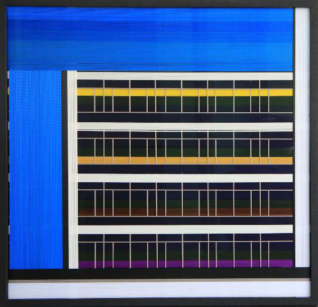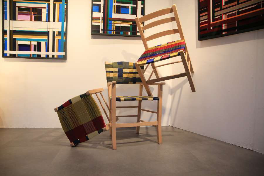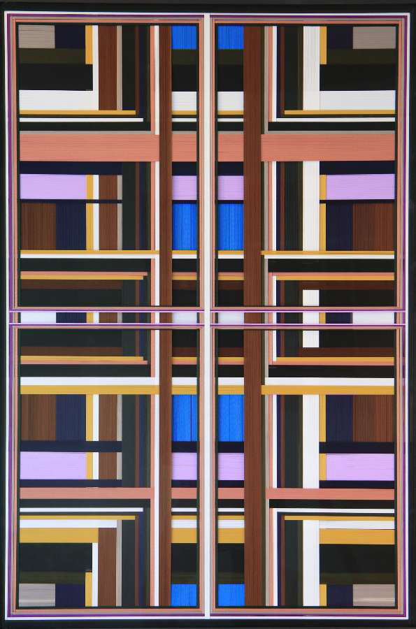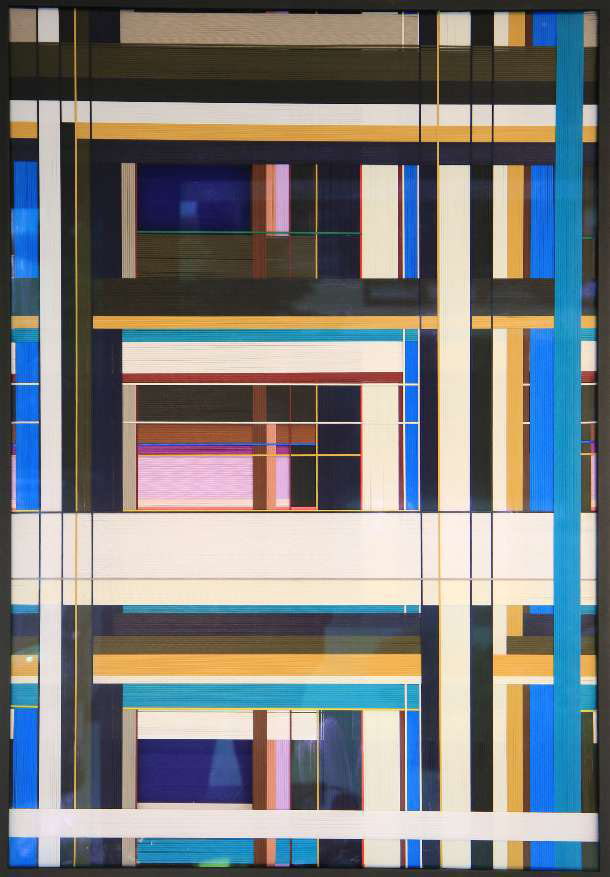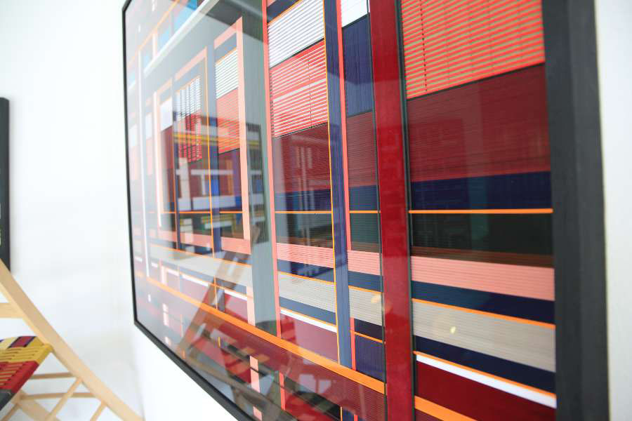 Lambros is inspired by all this. He feeds off the city's buildings and their lines, and whatever he swallows he puts it back on the canvas with ribbons and cords. When we are in his artwork, we do not walk on the familiar concrete city roads but on cotton sidewalks, in red houses and purple rooms. We live behind yellow doors and fall in love under blue ceilings. We become acrobats who walk on linear tightropes.