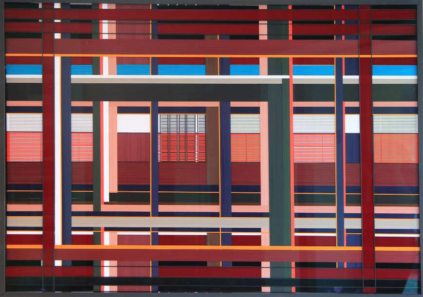 Lambros is inspired by all this. He feeds off the city's buildings and their lines, and whatever he swallows he puts it back on the canvas with ribbons and cords. When we are in his artwork, we do not walk on the familiar concrete city roads but on cotton sidewalks, in red houses and purple rooms. We live behind yellow doors and fall in love under blue ceilings. We become acrobats who walk on linear tightropes.